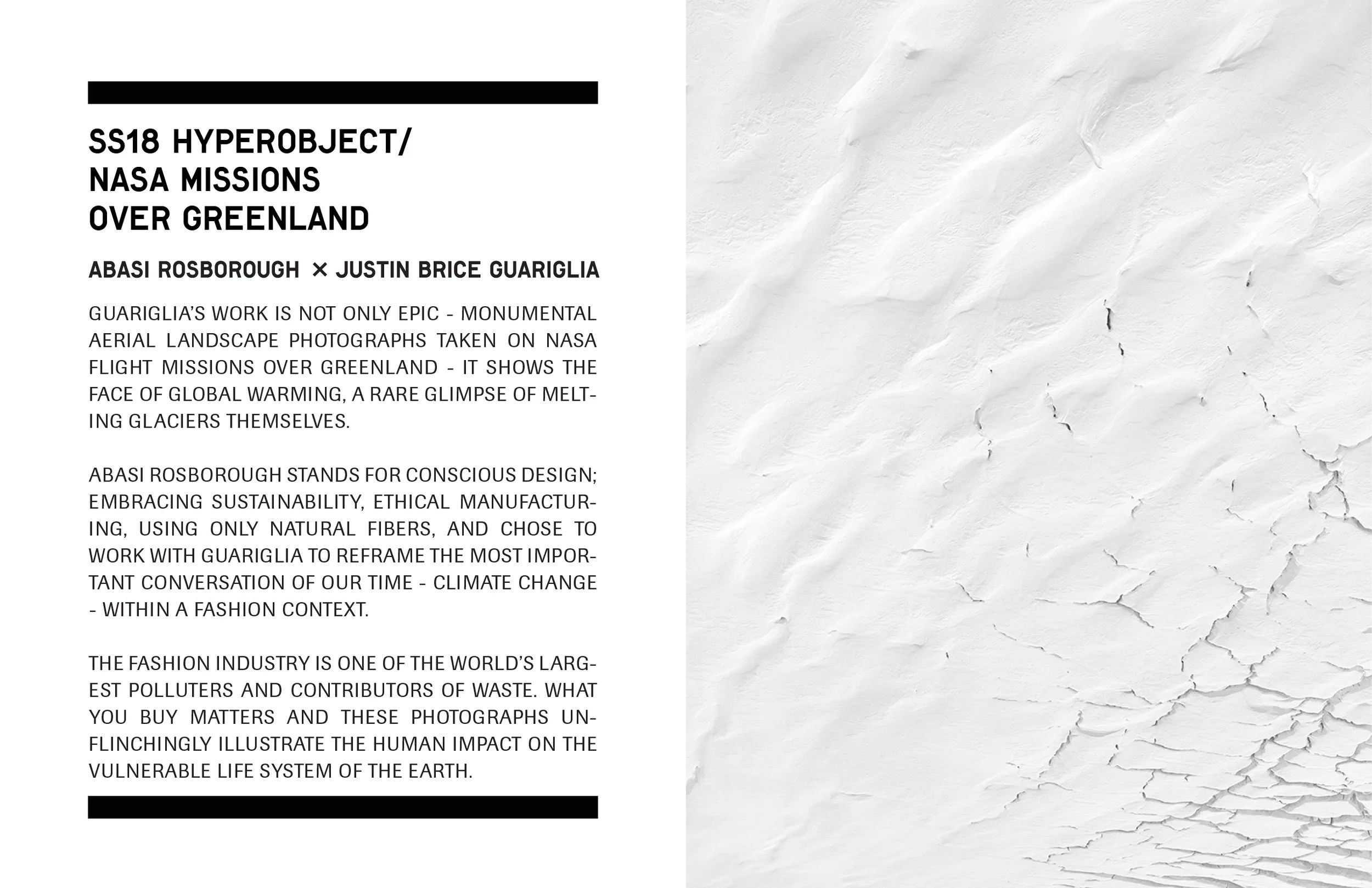 Transdisciplinary in nature, Justin Brice Guariglia is a contemporary visual artist who regularly collaborates with philosophers and scientists to unearth the complexities of our rapidly changing world. Guariglia flew with NASA scientists on research missions over Greenland, photographing the fracturing and melting glaciers from above with an intention to broaden climate change awareness, and literally show it in process.