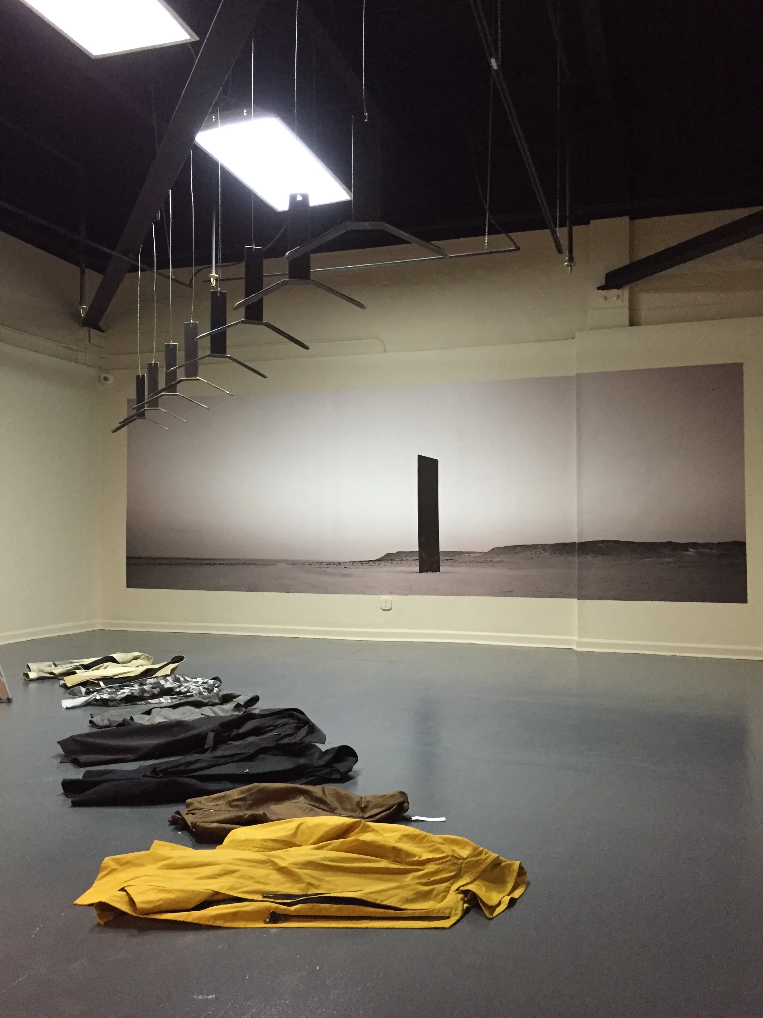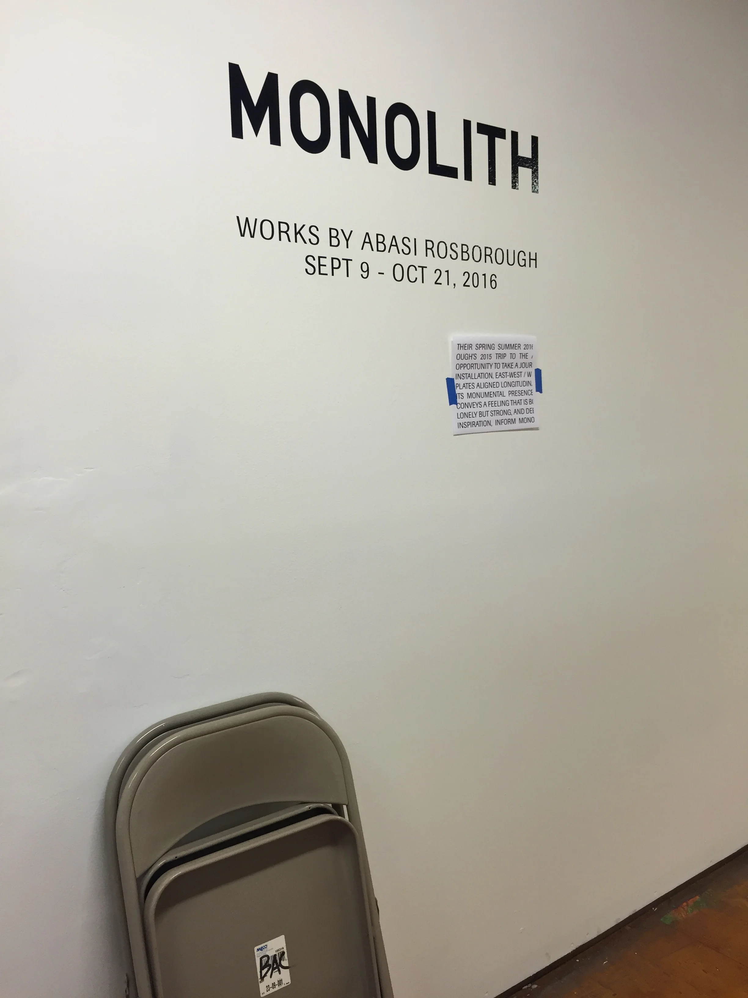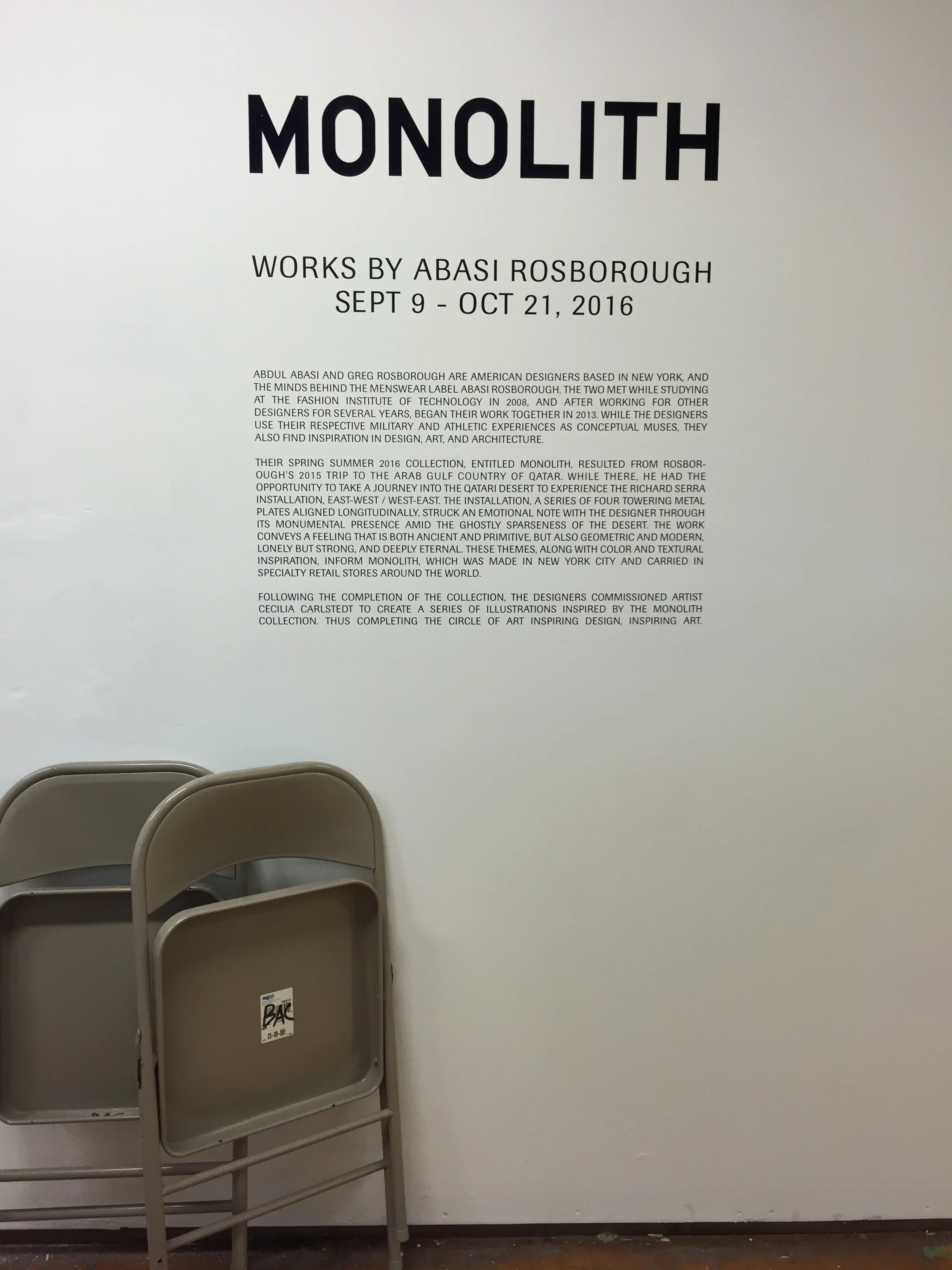 During a trip to Qatar, Greg Rosborough visited Richard Serra’s site-specific piece East-West/West-East. The experience greatly impacted him and inspired Abasi Rosborough’s spring-summer 2016 collection Monolith, which is the subject matter for this show. According to Webster’s New Twentieth Century Dictionary, a monolith (mon’ō.lith) n. is a “single large block or piece of stone, as in architecture or sculpture.” While Serra’s work is comprised of four monumental plates arranged according to the topography of the Brouq Nature Reserve in Qatar, the designers focused their collection on a singular large structure, rather than on multiplicity or a set geographic location.