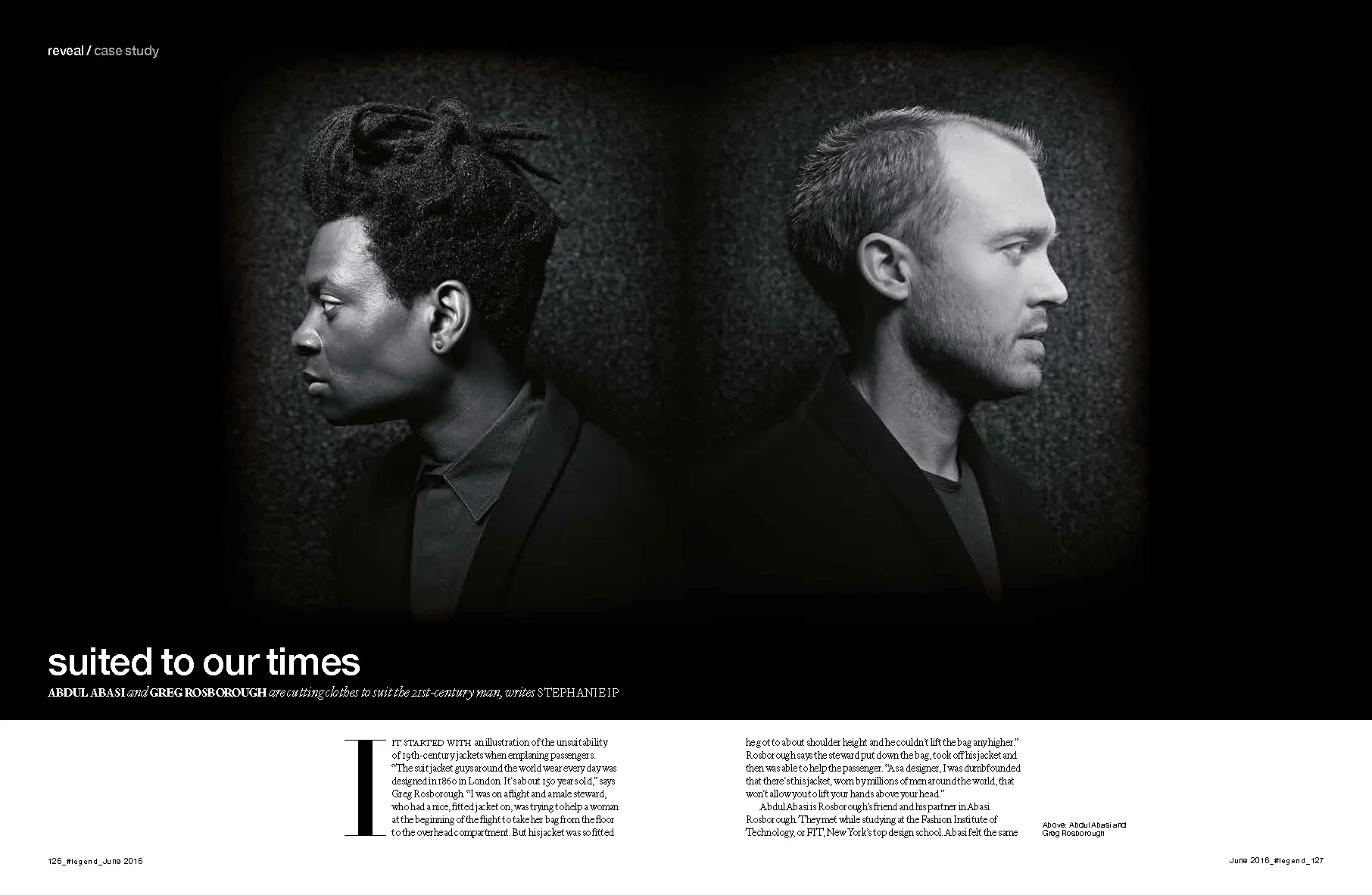 it started with an illustration of the unsuitability of 19th-century jackets on an airplane. “The suit jacket guys around the world wear every day was designed in 1860 in London. It’s about 150 years old,” says Greg Rosborough. “I was on a flight and a male steward, who had a nice, fitted jacket on, was trying to help a woman at the beginning of the flight to take her bag from the floor to the overhead compartment. But his jacket was so fitted that he got to about shoulder height and he couldn’t lift the bag any higher.” Rosborough says the steward put down the bag, took off his jacket and then was able to help the passenger. “As a designer, I was dumbfounded that there’s this jacket, the gold standard of menswear, worn by millions of men around the world every day, that respect your anatomy and won’t allow you to lift your hands above your head.”