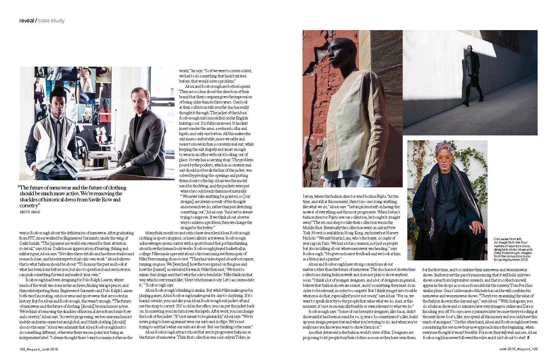 Another deterrent is the fashion world’s state of flux. Designers are proposing to let people buy their clothes as soon as they have seen them or the first time, and to combine their menswear and womenswear shows. Burberry set the pace by announcing that it will hold only two shows a year from September onwards, and that its collections will appear in the shops as soon as its models hit the runway. Tom Ford has similar plans. Gucci’s Alessandro Michele has said he will combine his menswear and womenswear shows. “They’re re-examining the value of the fashion show in this day and age,” says Abasi. “With Instagram, you do a fashion show and 10 minutes later every image is online and Zara is knocking you off. No one cares 15 minutes later because they’re looking at the next show. So it’s, like, you spend all this money and you only have this much of an impact.” On the other hand, Abasi and Rosborough have been considering the see-now-buy-now approach since the beginning, when everyone thought it wasn’t feasible. For now, they will wait and see. Abasi Rosborough has never followed the rules and it isn’t about to start.